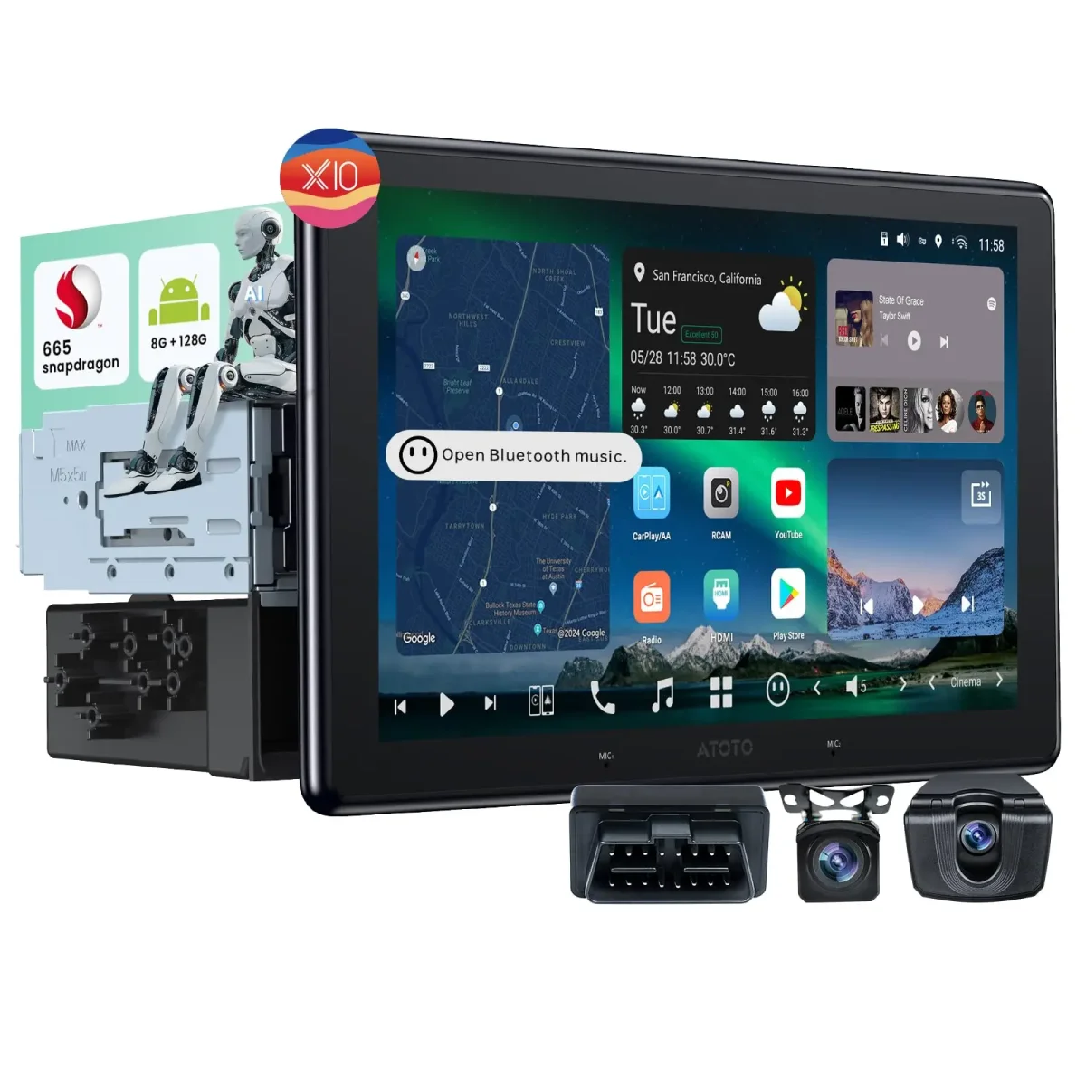 【50% OFF】X10 8-Core 10.1″ Single & Double Din Android 13 Car Stereo with 1080P Dash Cam Front and Rear +OBD2 Scanner 4in1, 8+128G Floating QLED Touchscreen Wireless CarPlay Android Auto Car Radio with ChatGPT