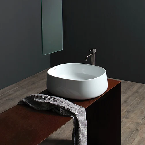 Lavabo d’appoggio con installazione su piano. Realizzato in ceramica bianca finemente smaltato. Cm. 45 x 45 x 15 h.