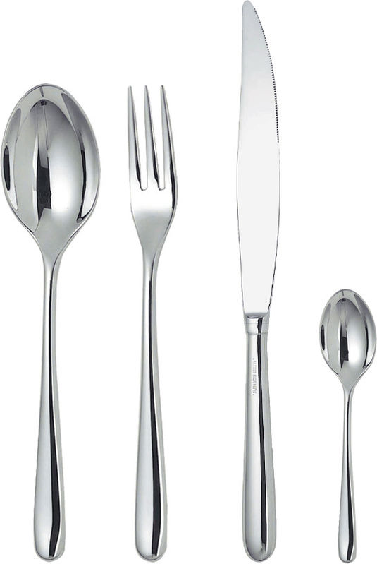 Alessi Caccia servizio posate 24 pezzi in acciaio inossidabile 18/10 lucido. Il servizio è composto da 6 forchette tavola, 6 coltelli tavola monoblocco, 6 cucchiai tavola, 6 cucchiaini tè. Disegnate da Pier Giacomo Castiglioni, Livio Castiglioni, Luigi Caccia Dominioni rappresentano un perfetto esempio di “classicismo lombardo”, progettate nel 1938.