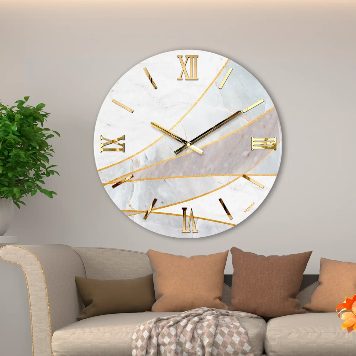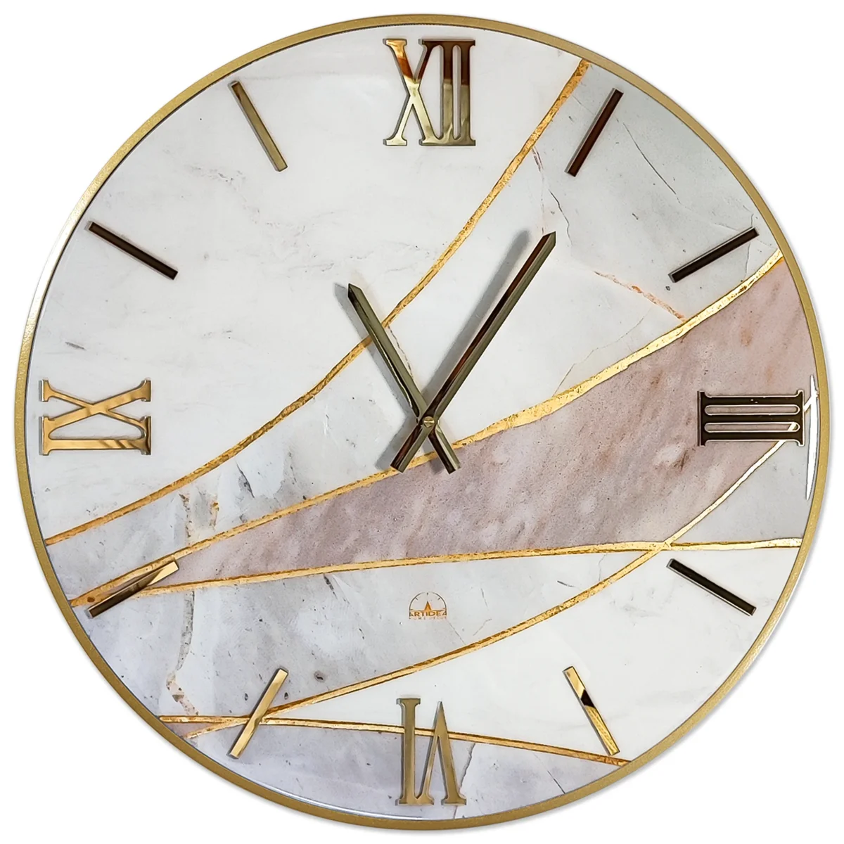 Orologio circolare con quadrante lucido, decorato a mano con foglia oro e numeri sovrapposti in Plex lucido con effetto specchio.