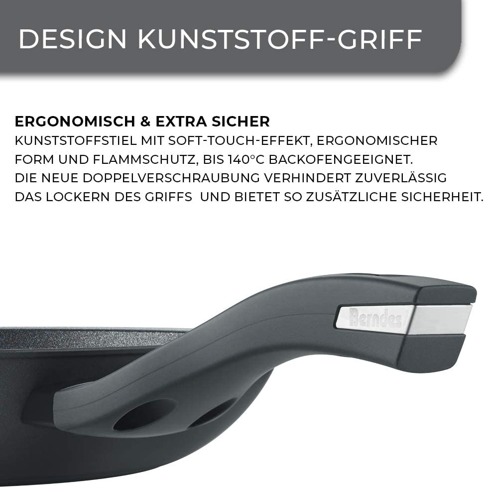 Berndes Balance Enduro Padella 20 cm; ALLUMINIO FORGIATO: per realizzare lo Strumento di Cottura viene utilizzato un Disco di Alluminio di alto spessore che viene poi Forgiato in fase di Formatura così da garantire una maggiore resistenza. Per la realizzazione vengono impiegate solo Leghe Adatte al Contatto con gli Alimenti. Le leghe autorizzate non contengono Arsenico, Piombo, Nichel o Cadmio. RIVESTIMENTO ANTIADERENTE TEFLON PROFILE: con Skin Technology, il rivestimento favorisce il distaccamento dei cibi e una cottura dorata. Adatto ad una cucina a basso contenuto di grassi. Il rivestimento esterno inoltre lo rende facile da pulire. No PFOA, No Nichel, No Bisfenolo A. FONDO ad INDUZIONE: la base a induzione è realizzata in acciaio ferromagnetico e, oltre al riscaldamento rapido, consente un’elevata efficienza energetica. Adatto a tutti i tipi di piastre. MANICI e MANIGLIE con Doppio Fissaggio TWIN BLOCK: il fissaggio a doppia vite garantisce massima sicurezza e stabilità nel tempo. I manici sono realizzati in Bakelite. La Bakelite è un Materiale Termoindurente perciò rimane fredda anche in fase di utilizzo, così da garantire una cucina sicura, senza scottarsi.