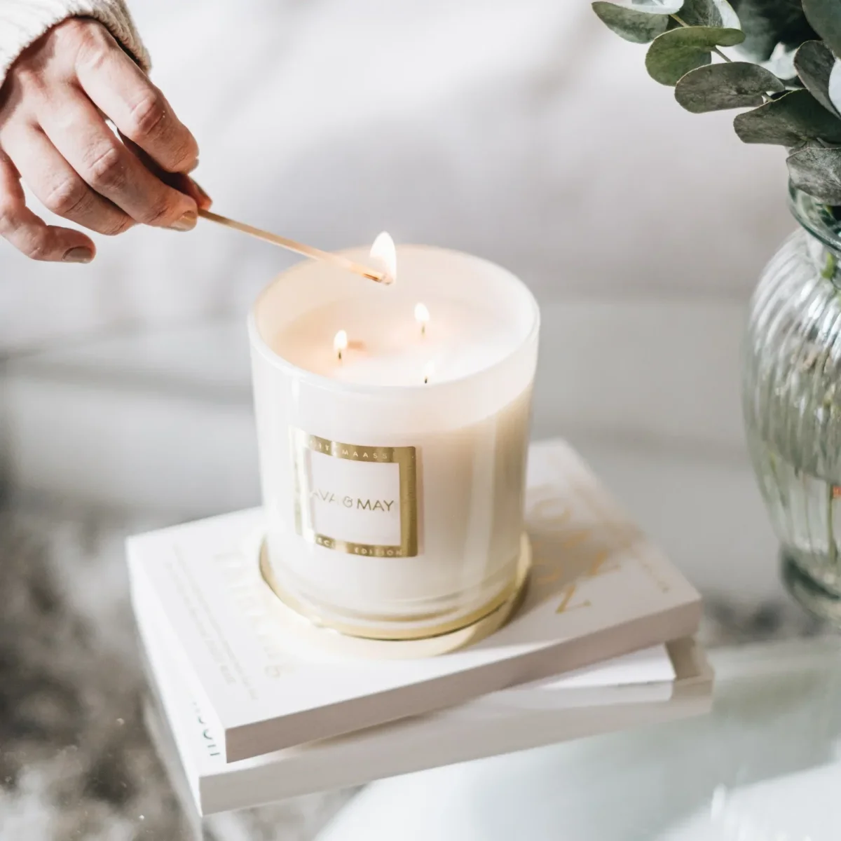La candela è dotata di un coperchio di metallo, che può essere utilizzato come base di appoggio o per chiudere la candela dopo l’uso. È realizzata con una miscela vegana di cera di soia e ha una durata di combustione di 70 ore.