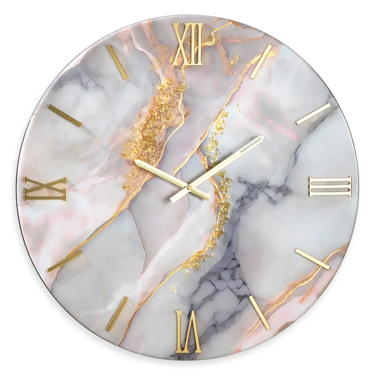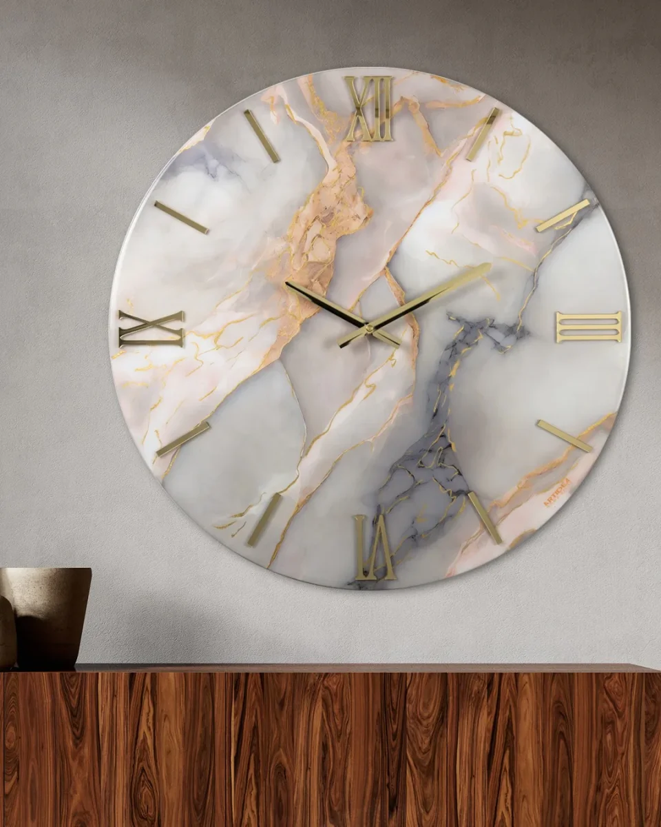 Orologio circolare con quadrante lucido, decorato a mano con foglia oro e numeri sovrapposti in Plex lucido con effetto specchio.