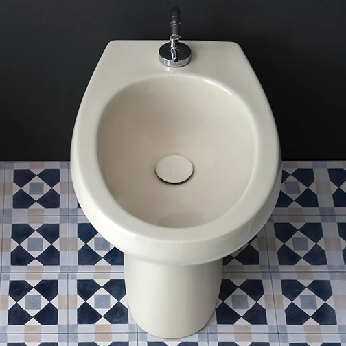 Bidet con carico/scarico acqua a parete ad installazione tradizionale a pavimento. Già forato centralmente per accogliere il miscelatore.