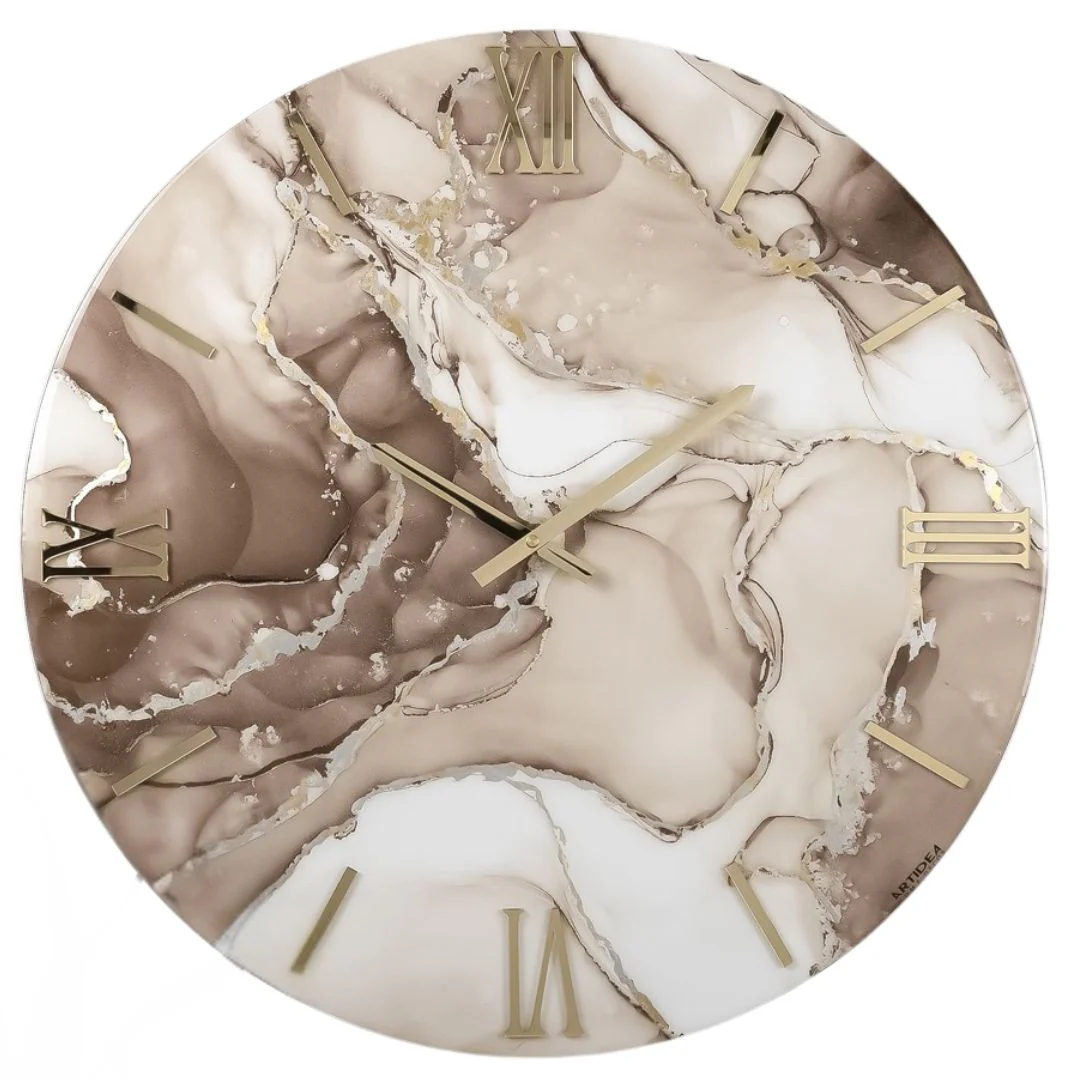Orologio circolare con quadrante lucido, decorato a mano con foglia oro e numeri sovrapposti in Plex lucido con effetto specchio.