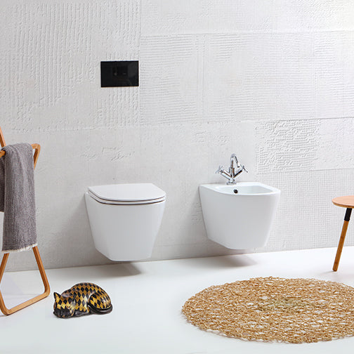 Bidet filo parete in ceramica smaltata bianco lucido, dal gusto minimale arreda con linearità e poche curve il tuo bagno. Con istallazione sospesa. L’articolo è completo di kit di fissaggio. Escluso della rubinetteria presente nella immagine.