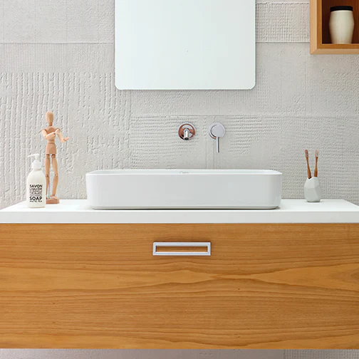 Lavabo d’appoggio con installazione su piano. Realizzato in ceramica bianca finemente smaltato.