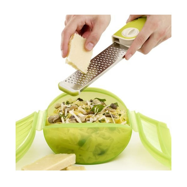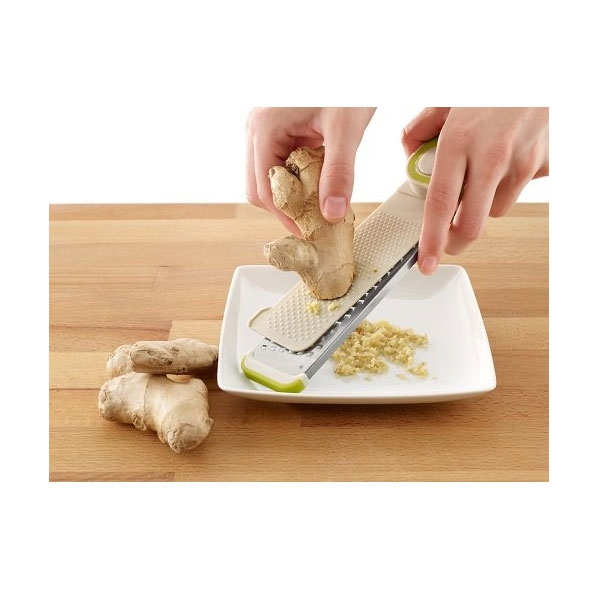 Lékué multigrater grattugia è una grattugia con 3 lame, due in acciaio e una in plastica, ideale per chi ha poco spazio. La grattugia realizza un taglio fine, uno grosso, la lama in plastica è pensata per lo zenzero e per l’aglio. Colore bianco e verde. Lunghezza 22 centimetri, larghezza 5 centimetri, altezza 2,6 centimetri.