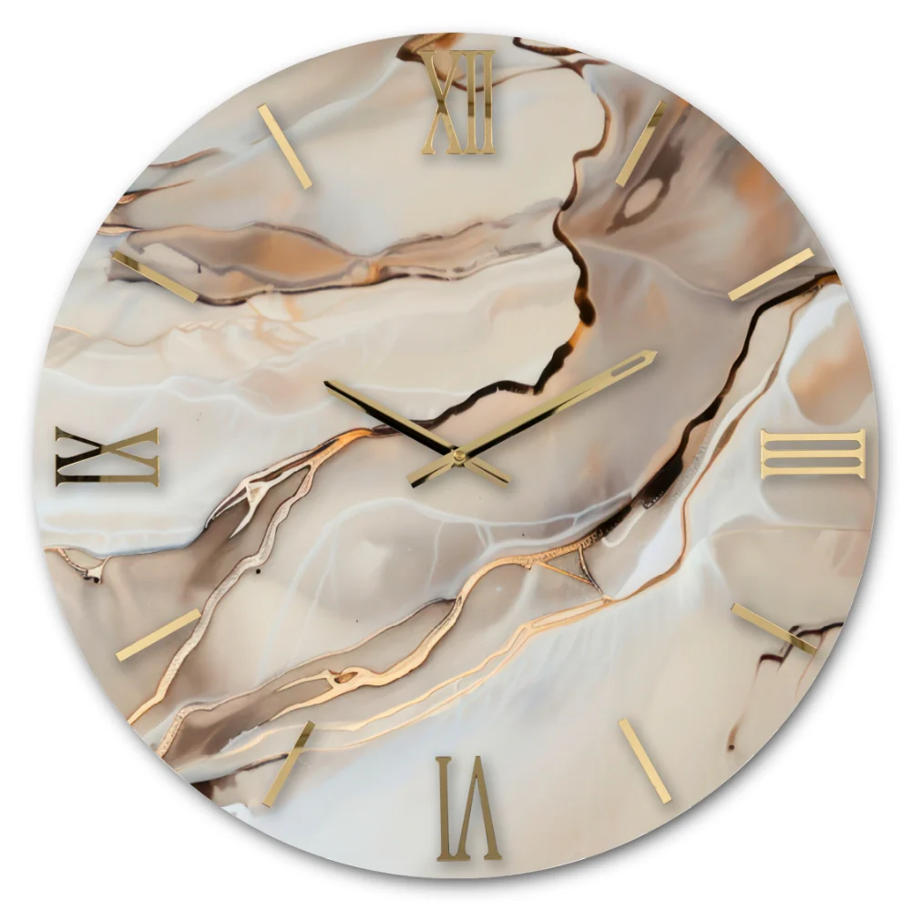 Orologio circolare con quadrante lucido, decorato a mano con foglia oro e numeri sovrapposti in Plex lucido con effetto specchio.