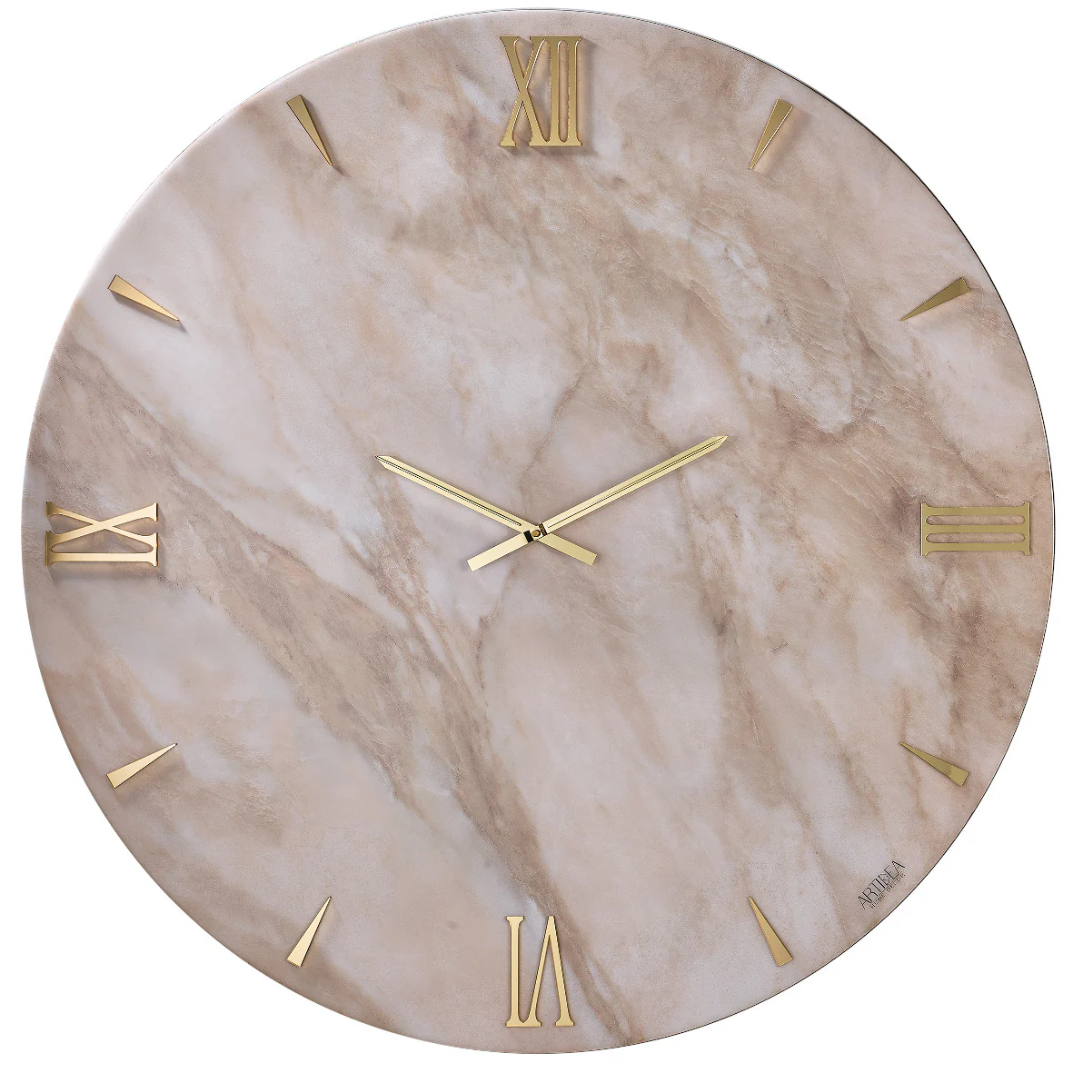 Orologio circolare con quadrante lucido, decorato a mano con foglia oro e numeri sovrapposti in Plex lucido con effetto specchio.