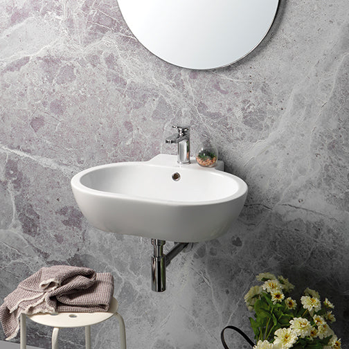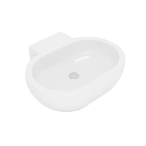 Lavabo d’appoggio su top o sospeso a parete, realizzato in fine ceramica e smaltato bianco lucido.