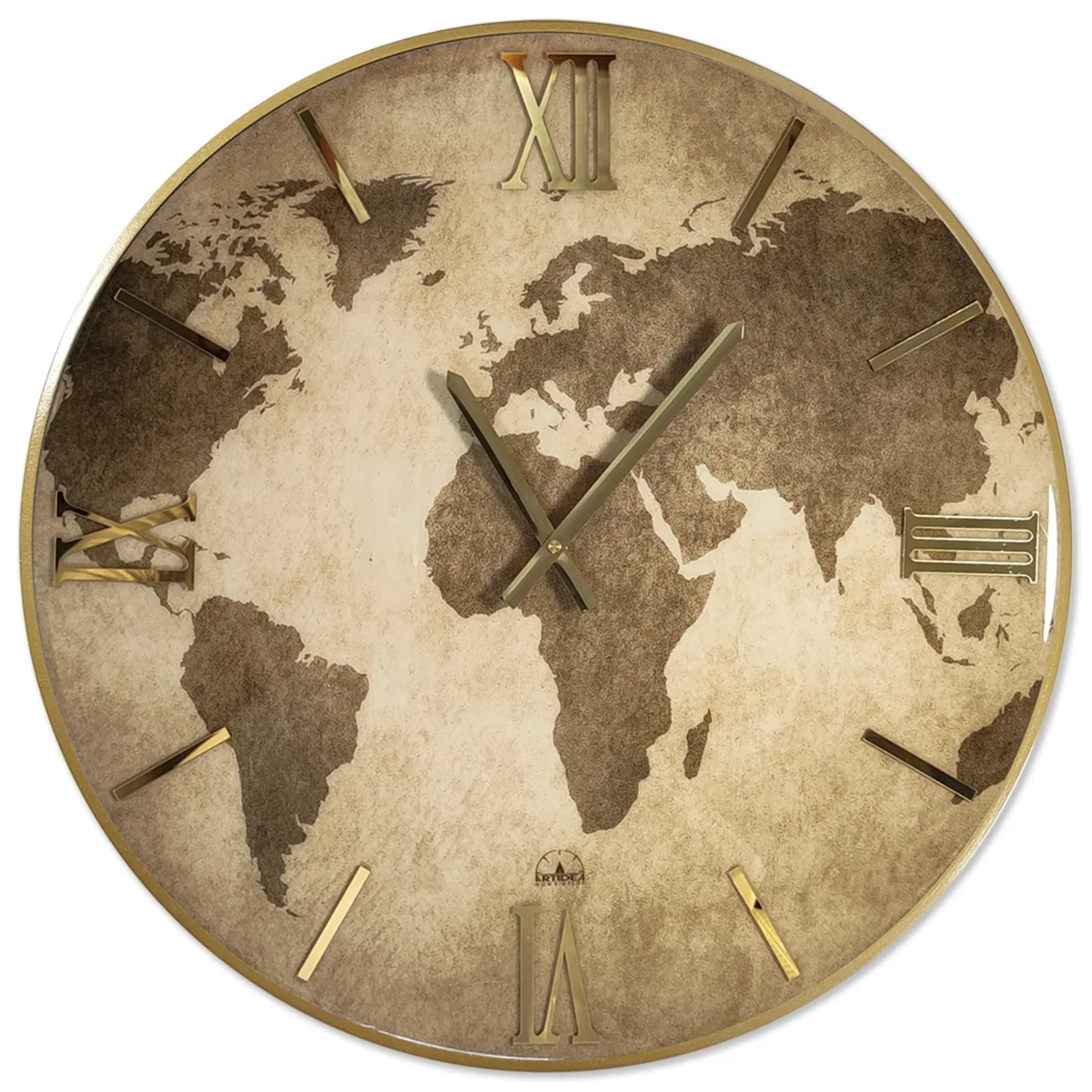 Orologio circolare con quadrante lucido, decorato a mano con foglia oro e numeri sovrapposti in Plex lucido con effetto specchio.