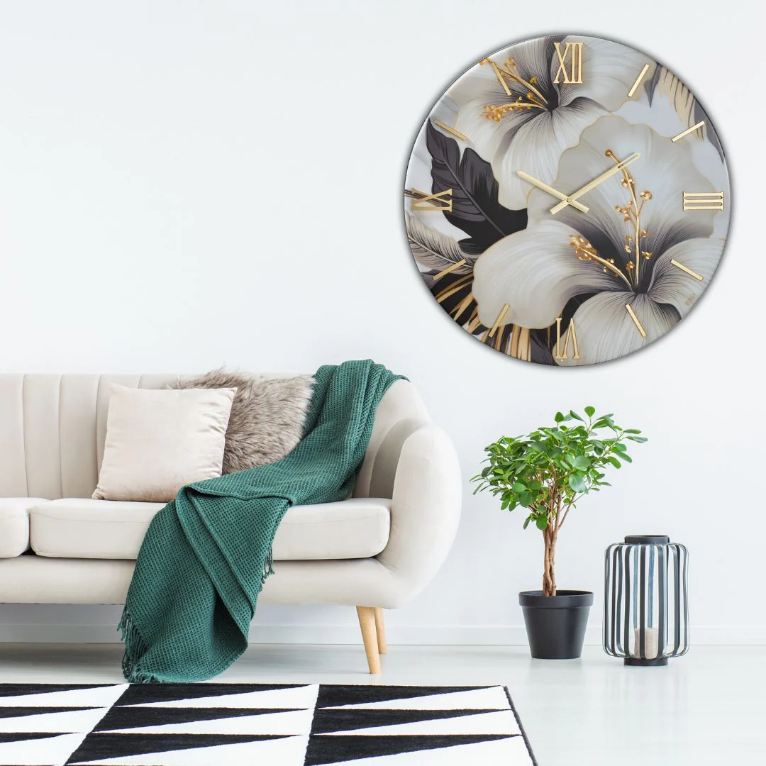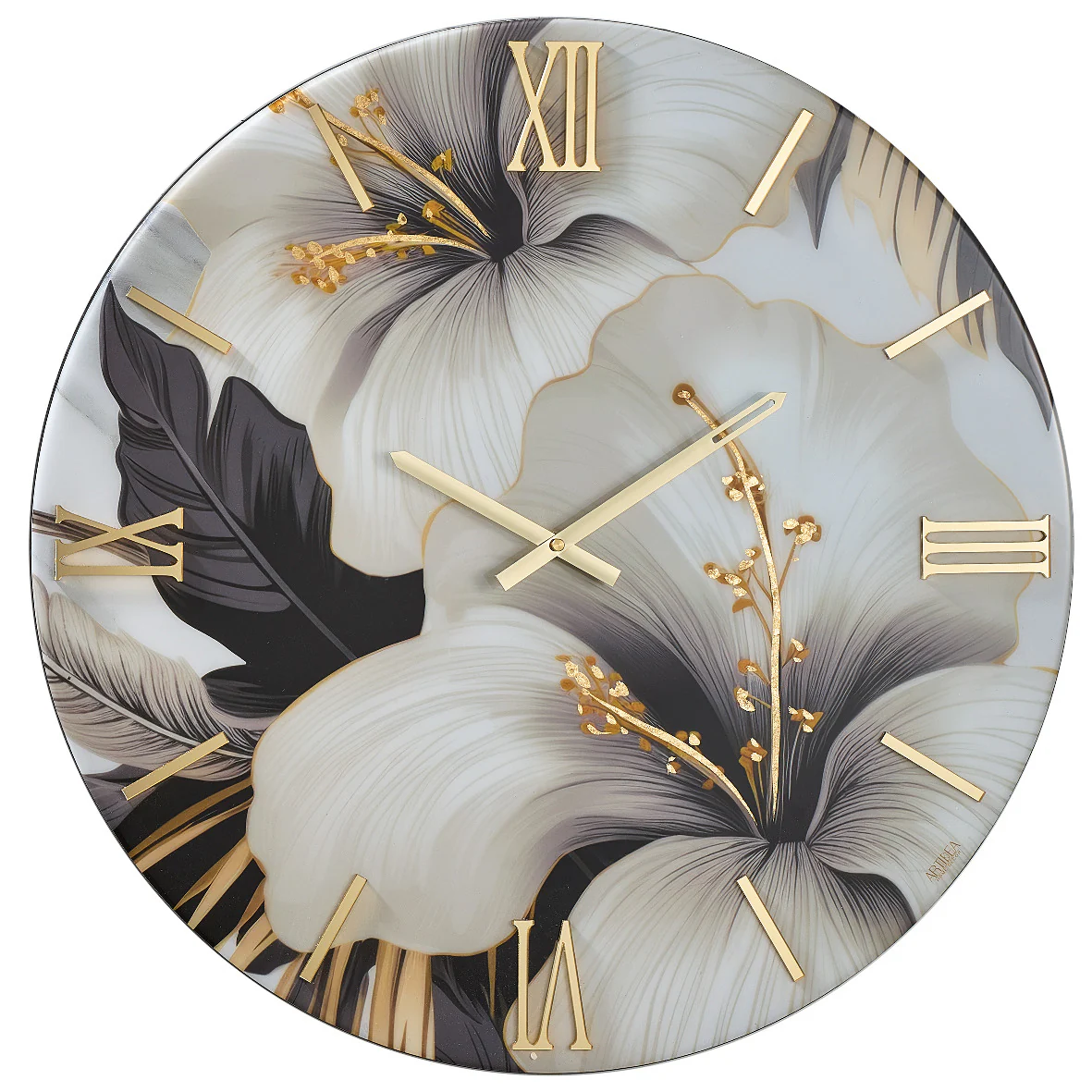 Orologio circolare con quadrante lucido, decorato a mano con foglia oro e numeri sovrapposti in Plex lucido con effetto specchio.