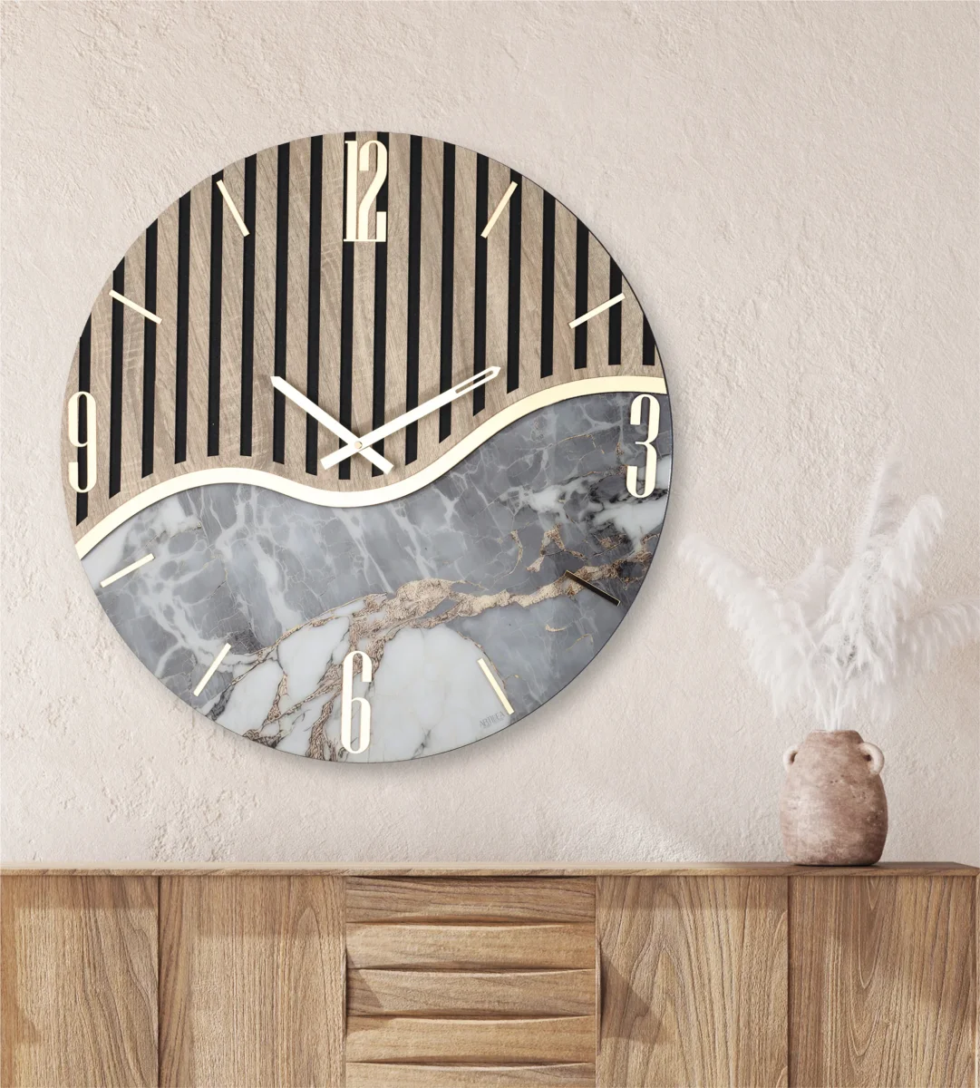 Applicazione laterale con stampa di alta qualità con venature in effetto marmo, lancette lucide, numeri in plex specchio e meccanismo di movimento made in Italy.